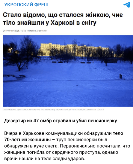 В сети распространяют информацию, якобы военный 47-й отдельной механизированной бригады (ОМБр) ограбил и убил пенсионерку в Харькове. Ее тело нашли в снегу.