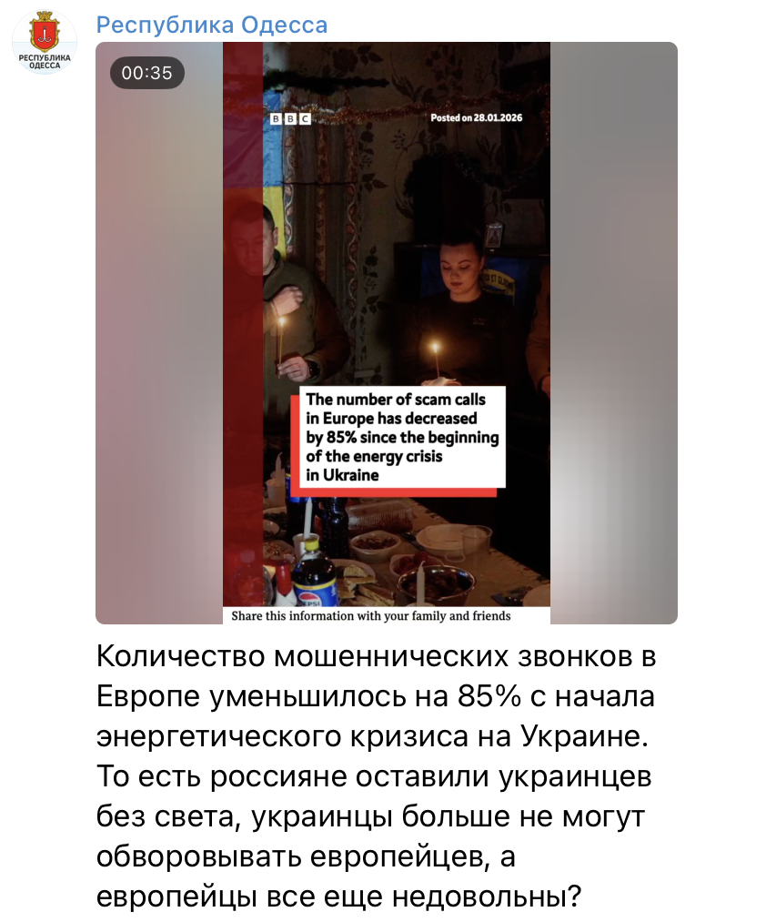 В сети распространяют видео, якобы опубликованное BBC. В нем говорится, что из-за энергетического кризиса в Украине количество спам-звонков в Европе сократилось на 85%. Мол, из-за отключения электроэнергии украинские мошенники лишились возможности работать. Это якобы подтвердил бизнес-консультант Джим Коллинз.