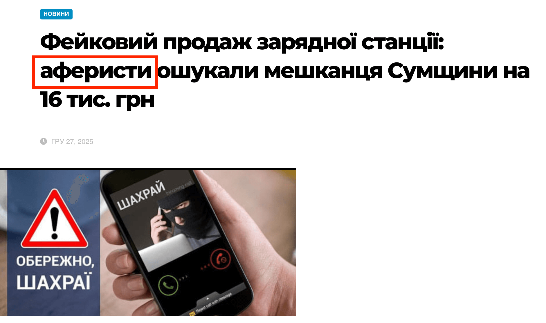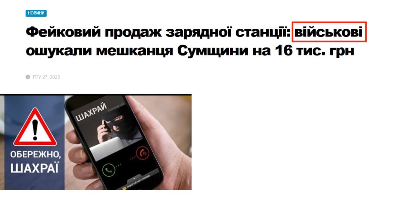 По обратному поиску в Google мы выяснили, что в сообщении использовали скриншот материала новостного сайта Odin Doma Sumy от 27 декабря 2025 года. Оформление сайта и время публикации этой новости и материала со скриншота пропагандистов идентичны. Однако заголовок оригинальной новости другой — «Фейковая продажа зарядной станции: аферисты обманули жителя Сумщины на 16 тыс. грн».
