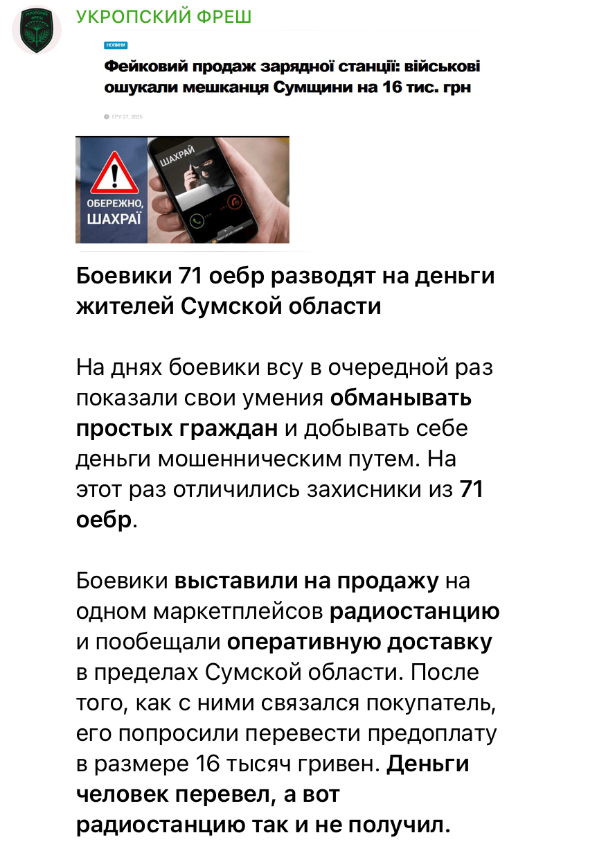 Российские телеграм-каналы распространяют скриншот якобы новости украинского медиа. В ней говорится, что бойцы 71-й отдельной егерской бригады обманули жителя Сумщины на 16 тыс. грн — пытались продать ему радиостанцию и взяли за нее предоплату. После этого они не доставили товар и исчезли, оставив покупателя ни с чем.