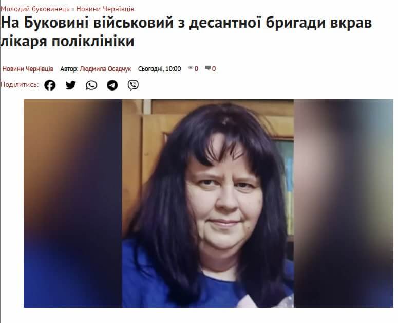 Российские телеграм-каналы распространяют скриншот якобы новости украинского СМИ. В ней говорится, что на Буковине военнослужащий 82-й отдельной десантно-штурмовой бригады похитил врача из поликлиники.
