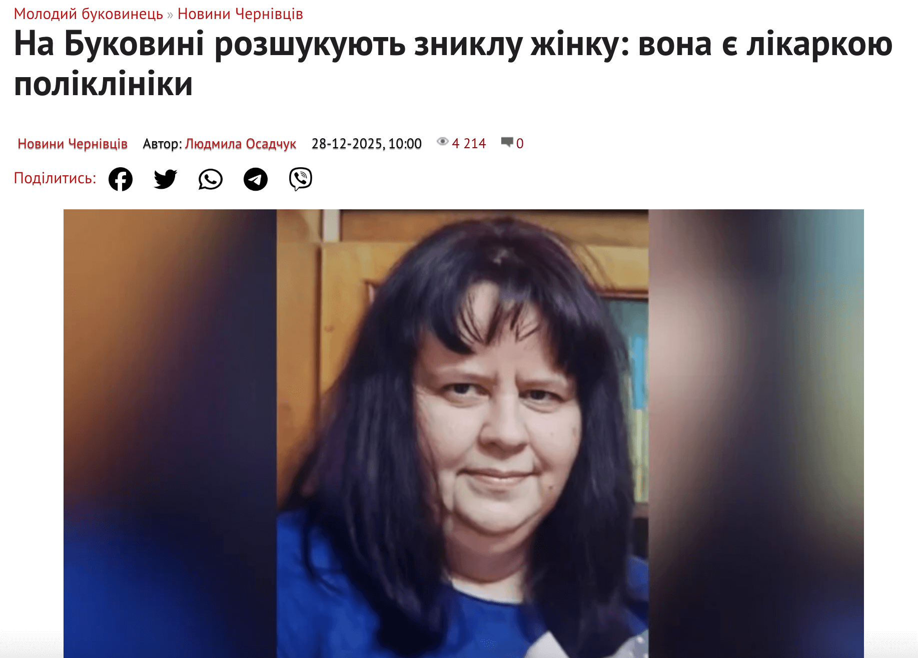 По обратному поиску в Google мы выяснили, что в сообщении использовали скриншот материала черновицкого СМИ «Молодой буковинец» от 28 декабря 2025 года. Оформление сайта и время публикации новости «Молодого буковинца» и материала со скриншота пропагандистов идентичны. Однако заголовок оригинальной новости другой — «На Буковине разыскивают пропавшую женщину: она является врачом поликлиники».