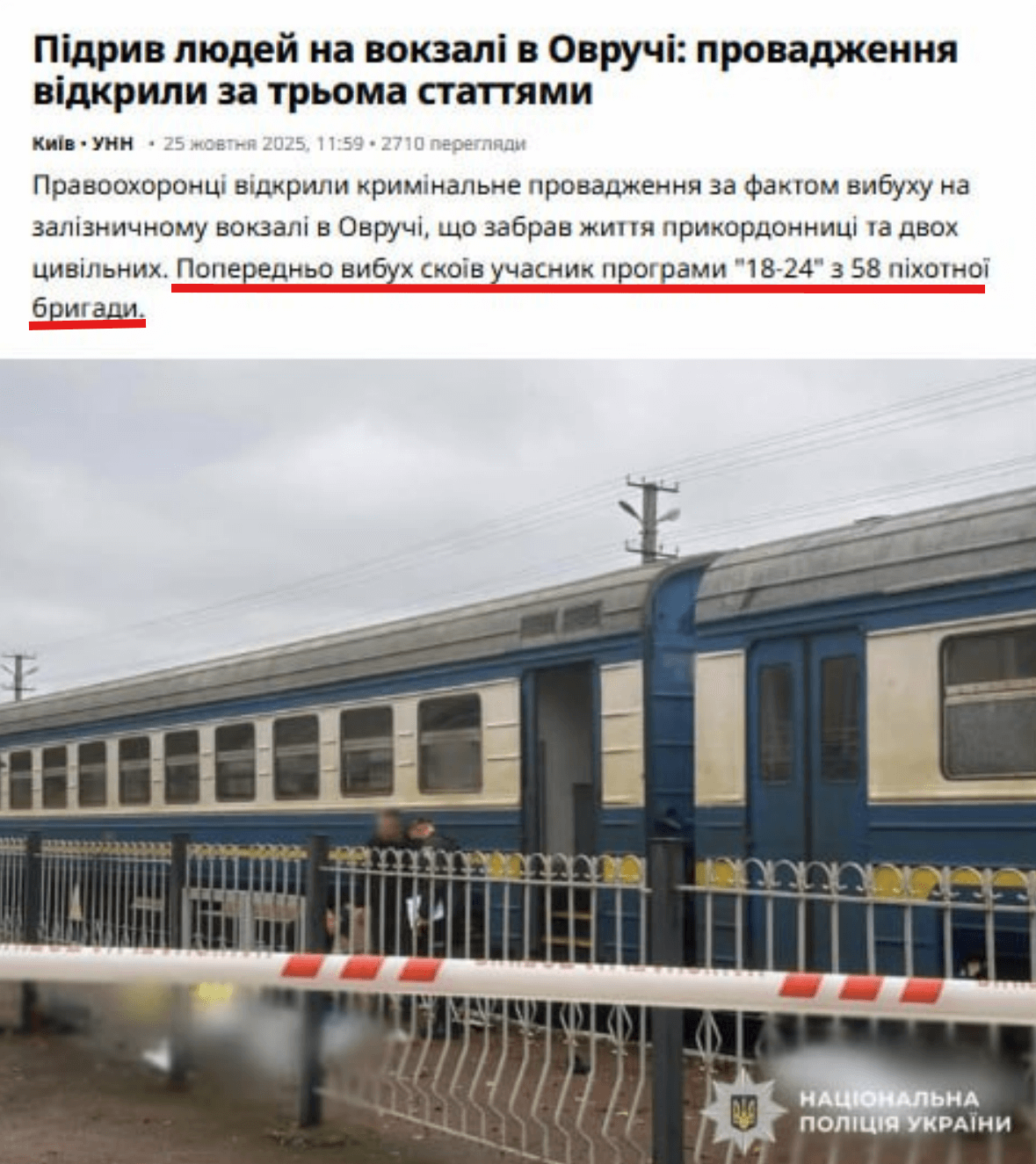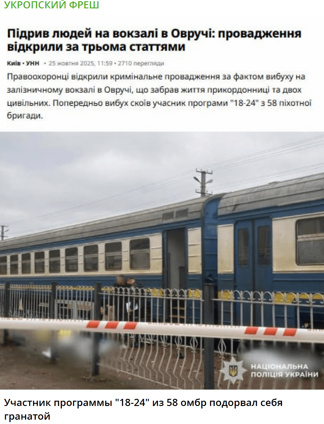 24 октября 2025 года в городе Овруч Житомирской области на перроне вокзала мужчина взорвал гранату. В результате погиб сам мужчина и еще три человека, а двенадцать получили ранения. Как сообщили в Нацполиции, гранату взорвал 23-летний житель Харькова. Однако там не уточняли, был ли он участником программы «Контракт 18-24».