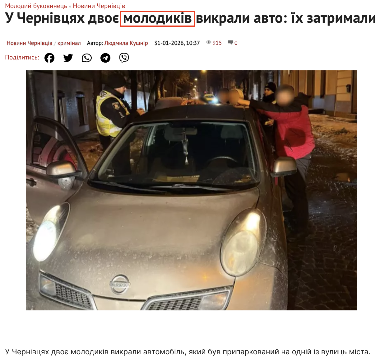 По ключевым словам мы выяснили, что подобная новость действительно существует. 31 января медиа «Молодой буковинец» опубликовало новость, что в Черновцах двое молодых людей угнали автомобиль, из-за чего их задержали. Однако ни в статье, ни в сообщении Главного управления Национальной полиции в Черновицкой области не упоминалось, что задержанные являются военными.