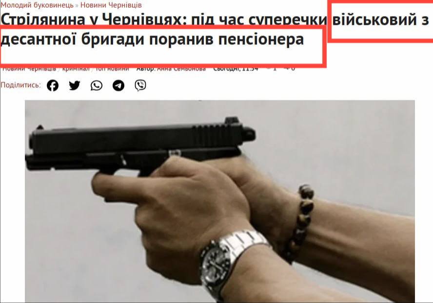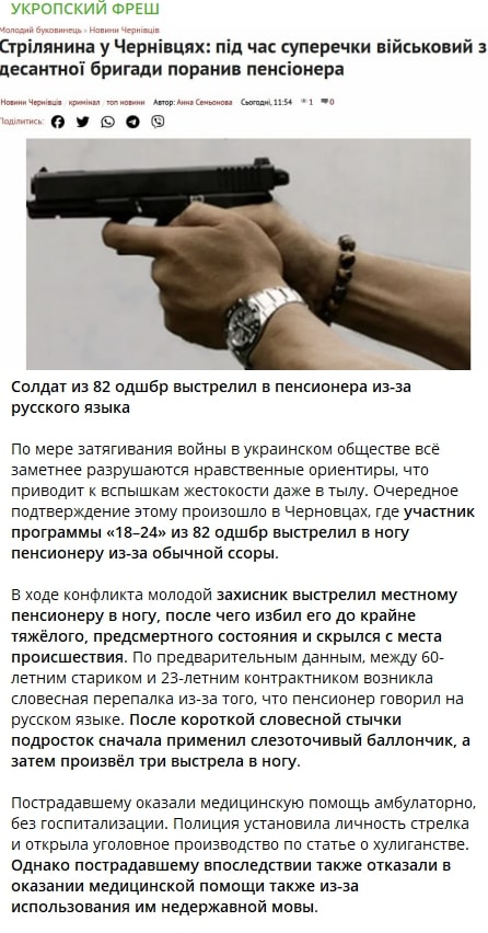 Российские телеграм-каналы распространяют якобы скриншот статьи медиа «Молодой буковинец». В ней говорится, что в Черновцах 23-летний военный 82-й ОДШБр, участник программы «Контракт 18-24», стрелял в пенсионера. Отмечают, что конфликт возник якобы из-за российского языка. Мол, из-за языка общения пострадавшему отказали в оказании медицинской помощи.