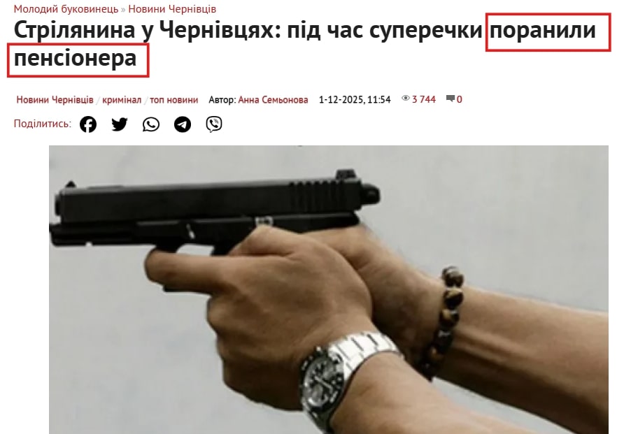 По обратному поиску в Гугле мы нашли статью, скриншот из которой использовали в фейке. Материал был опубликован 1 декабря 2025 года на сайте издания «Молодой буковинец». В тексте говорится, что 29 ноября в Черновцах во время спора 27-летний мужчина предположительно из пневматического пистолета ранил 60-летнего пенсионера. Медиа не сообщало о причастности мужчины к Силам обороны.