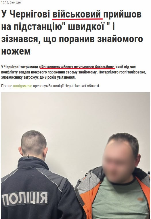 Российские телеграм-каналы распространяют скриншот новости украинского СМИ. В ней говорится, что военный 48-го ОШБ пришел на подстанцию «скорой» и признал, что во время конфликта нанес ножевое ранение своему знакомому. Отмечают, что ему грозит 8 лет тюрьмы.
