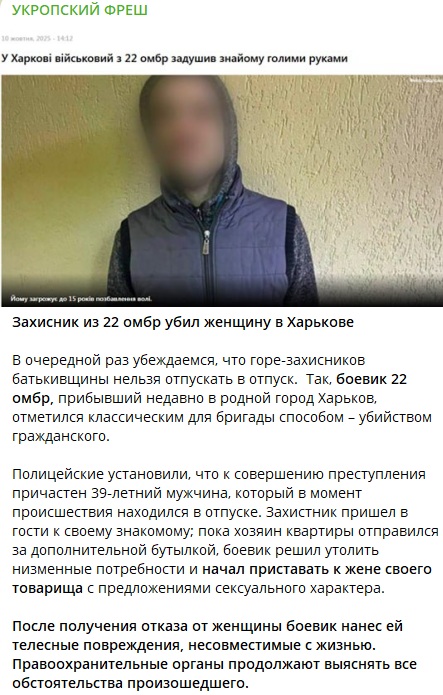 Российские телеграм-каналы распространяют скриншот статьи украинского СМИ. В ней говорится, что военный 22-й ОМБр убил свою знакомую голыми руками.