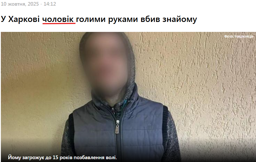 По ключевым словам мы нашли настоящую статью, которую 10 октября 2025 года опубликовало медиа Kharkiv Today. В тексте говорится, что в Харькове мужчина убил знакомую во время застолья, когда спор перерос в драку — полиция уже задержала подозреваемого, ему грозит до 15 лет лишения свободы. Однако в материале нет ни одного упоминания о деятельности мужчины.