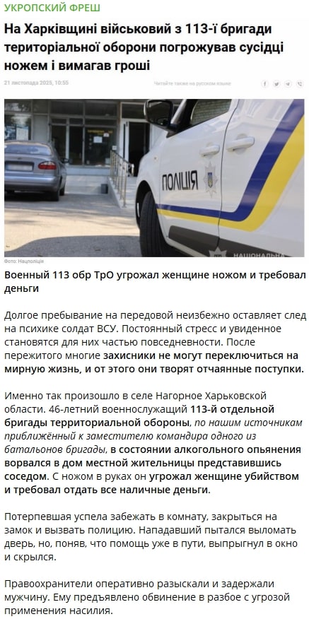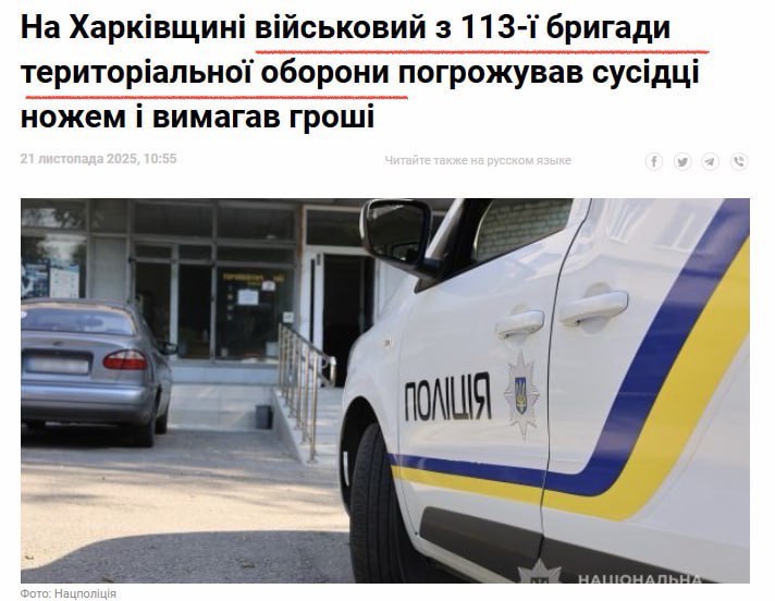 Российские телеграм-каналы распространяют якобы скриншот новости украинского СМИ. В ней говорится, что в селе Нагорное Харьковской области нетрезвый военный 113-й ОБрТрО ворвался в дом соседки, угрожал ей ножом и требовал деньги.