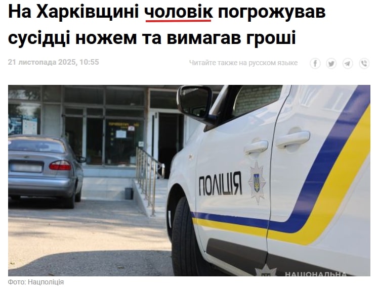 По обратному поиску в Гугле мы нашли настоящую статью, которую 21 ноября 2025 года опубликовало СМИ RegioNews. В тексте действительно говорится, что в селе Нагорное Харьковской области 46-летний мужчина ворвался в дом соседки, угрожал ей кухонным ножом и требовал деньги. Правоохранители задержали мужчину, и теперь ему грозит до 12 лет тюрьмы. Впрочем, ни в статье RegioNews, ни в сообщении Нацполиции Харьковской области нет ни одного упоминания о роде деятельности подозреваемого.