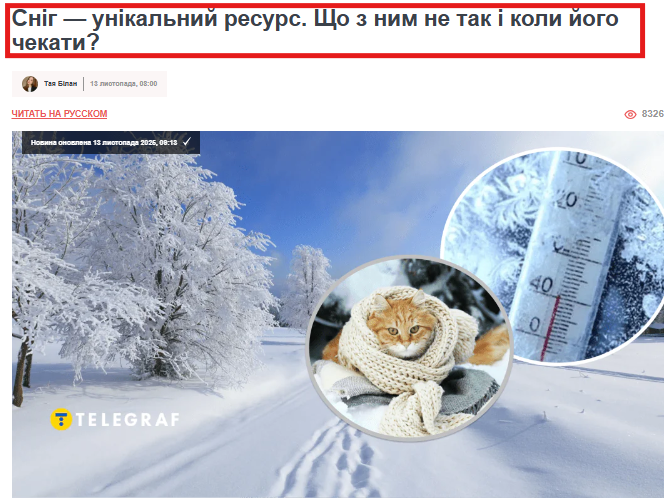 В сети распространяют якобы скриншот статьи с портала Telegraf с заголовком «Снег ждать преждевременно: путь зимы в Украину перекрыл антициклон из Европы». Утверждают, что об этом заявил начальник Черкасского областного гидрометцентра Виталий Постригань.