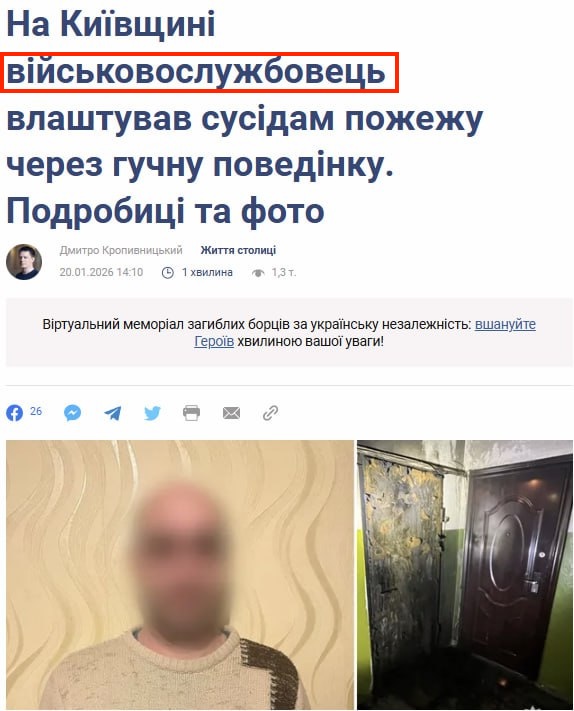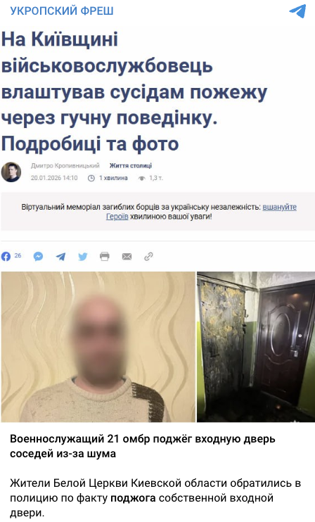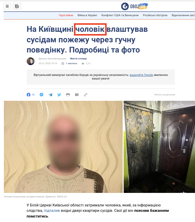 По ключевым словам мы выяснили, что подобная новость действительно существует. 20 января медиа Oboz.ua опубликовало новость, что в Белой Церкви задержали мужчину, который поджег входную дверь квартиры соседей, поскольку ему мешал шум. Однако ни в статье Oboz.ua, ни в сообщении Главного управления Национальной полиции в Киевской области не упоминалось, что подозреваемый является военным.