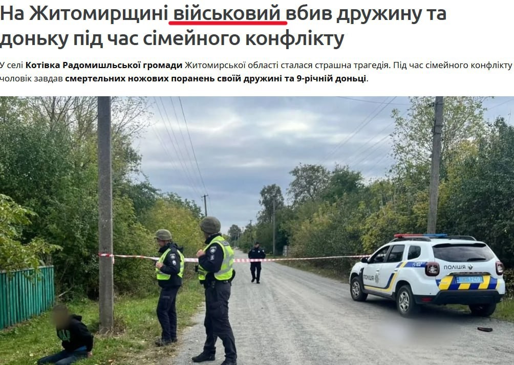 Российские телеграм-каналы распространяют скриншот статьи украинского СМИ. В ней якобы говорится, что в селе Котовка Житомирской области военный 95-й ОШБр убил свою жену и дочь из-за семейного конфликта.