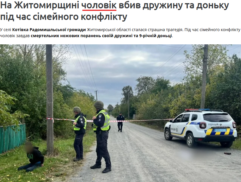 По ключевым словам мы нашли новость, на которую ссылаются пропагандисты. Ее опубликовало житомирское интернет-издание «Субота» 4 октября 2025 года. В тексте действительно пишут, что в селе Котовка Житомирской области мужчина во время семейного конфликта смертельно ранил свою жену, 9-летнюю дочь и соседку, а также убил двух кошек и собаку. Подозреваемого задержали, и правоохранители начали уголовное производство.