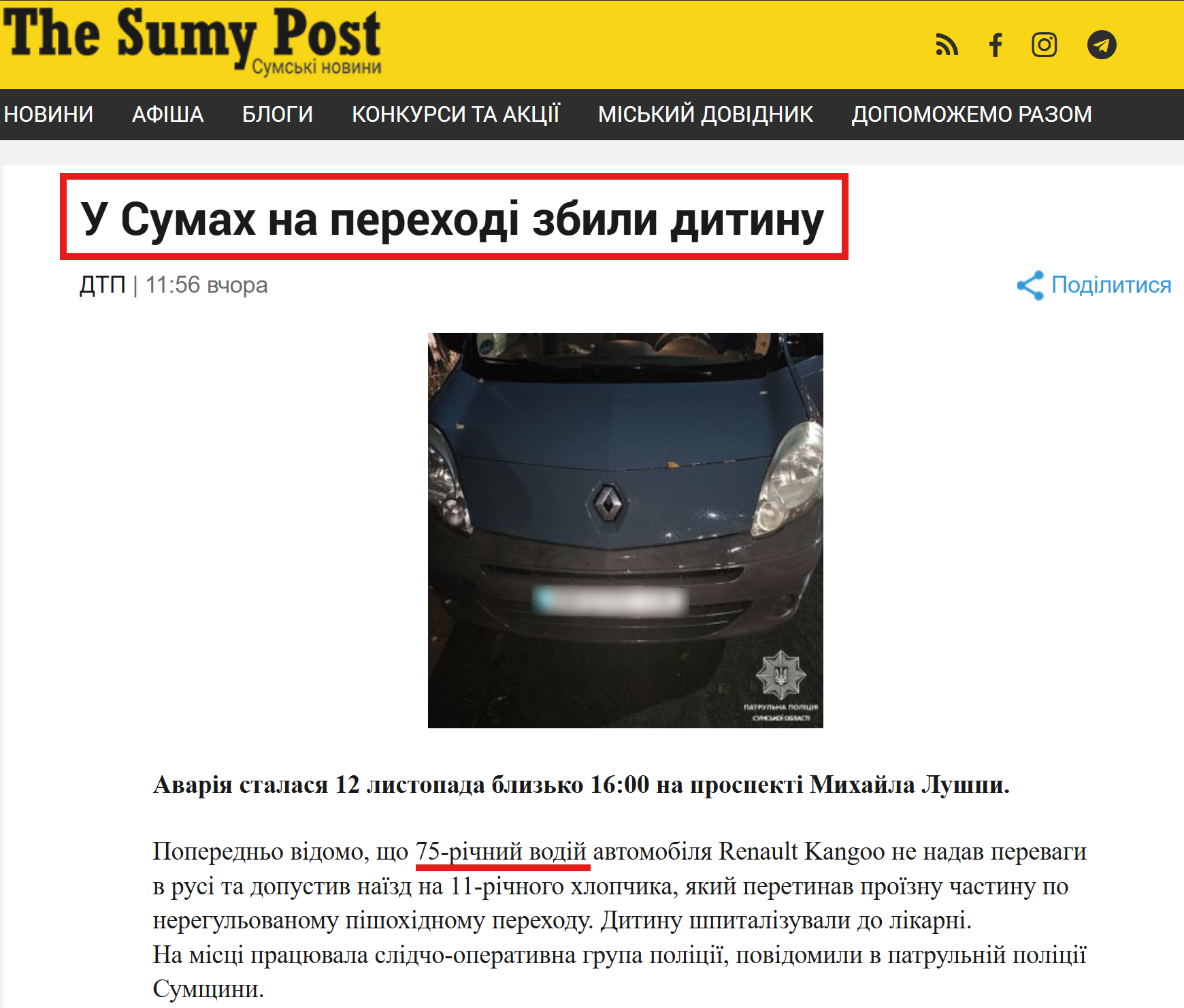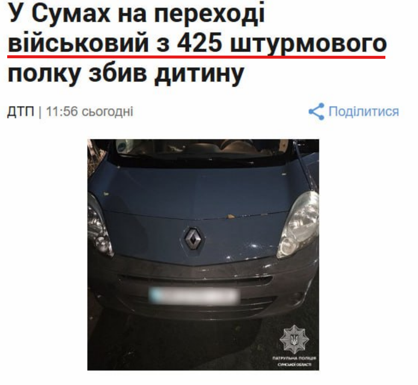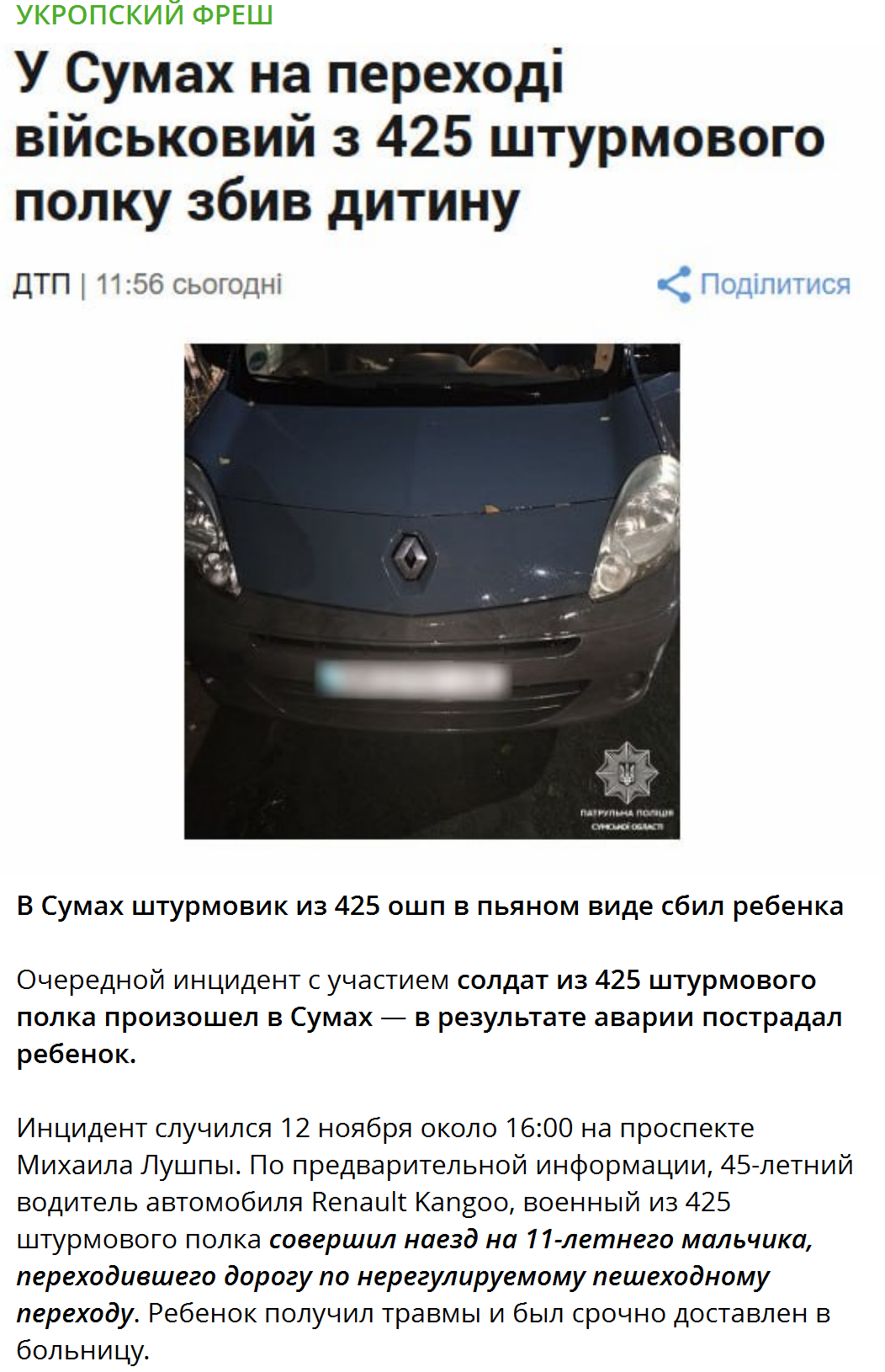Российские телеграм-каналы распространяют информацию, якобы военный из 425-го отдельного штурмового полка сбил ребенка в Сумах. В качестве «доказательства» добавляют скриншот из статьи украинского СМИ.
