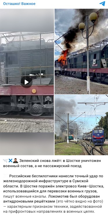 Российские телеграм-каналы распространяют информацию, якобы украинские власти выдали уничтоженный 4 октября 2025 года российским беспилотником военный поезд в Шостке за пассажирский. Авторы постов указывают, что рф поразила электровоз «Киев — Шостка», который использовался для перевозки военных грузов.