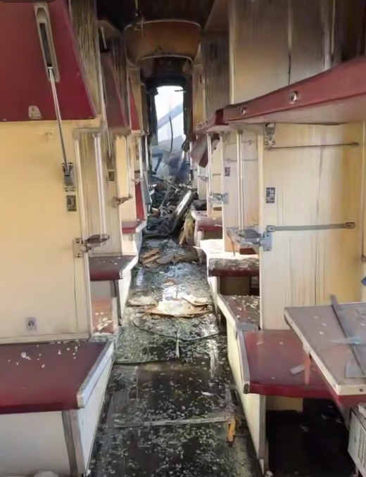 СМИ также опубликовали последствия разрушений внутри пассажирского вагона поезда. В результате погиб 71-летний мужчина, еще восемь человек госпитализировали, среди них трое детей.