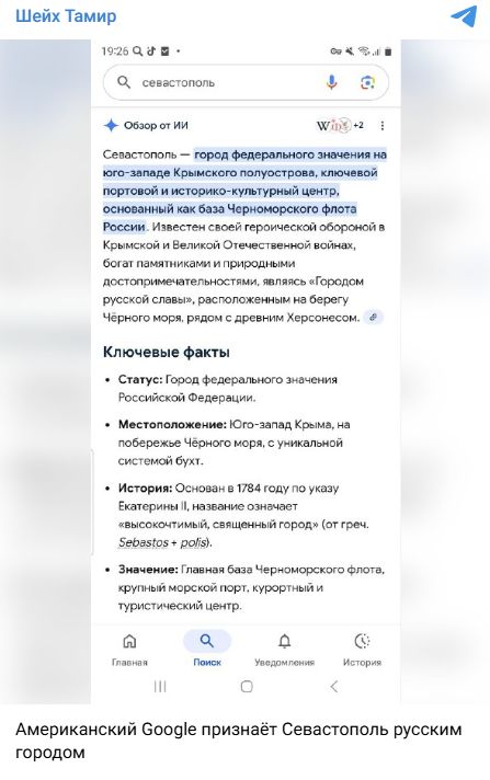 Это манипуляция. Google не признавал Севастополь российским городом. На фото — не официальная позиция компании, а ответ функции AI Overview. Она автоматически формирует обобщение на основе источников, доступных для конкретного языкового и регионального запроса.