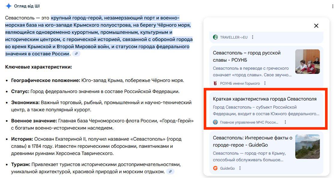 Если запрос делается из рф или на русском языке, AI Overview подготовит материал на основе источников, где используется русский язык. А поскольку часть информации ИИ берет из российских ресурсов, в результатах Крым может указываться как территория россии.