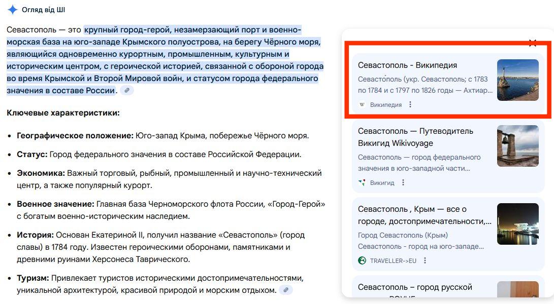 Поэтому важно проверять источники, на которые ИИ опирается при формировании ответа. Например, в случае с Севастополем нейросеть ссылается на российскую Википедию и Главное управление МЧС рф.