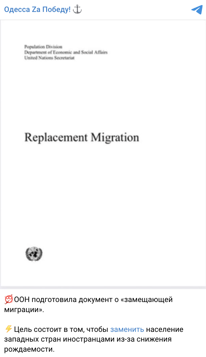 Документ с таким названием действительно существует и опубликован на официальном сайте ООН, однако еще в марте 2000 года. Более того, он не содержит никакого плана по «замене» населения. Это аналитическое исследование, где моделируются гипотетические демографические сценарии для отдельных стран мира. Примечательно, что, по словам пропагандистов, политику «замещающей миграции» якобы планируют применять только для западных стран, хотя исследование проводилось и для рф, и для Японии, и для Южной Кореи.