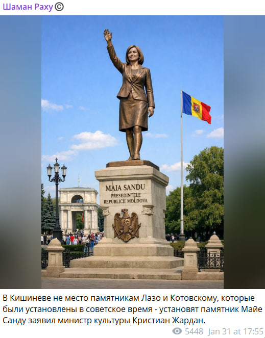 В сети распространяют информацию, якобы министр культуры Молдовы Кристиан Жардан заявил, что в Кишиневе на месте памятников Сергею Лазо и Григорию Котовскому, установленных в советское время, поставят памятник Майе Санду. К сообщению добавляют фото якобы проекта монумента.