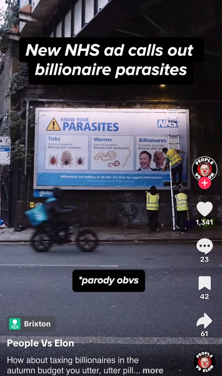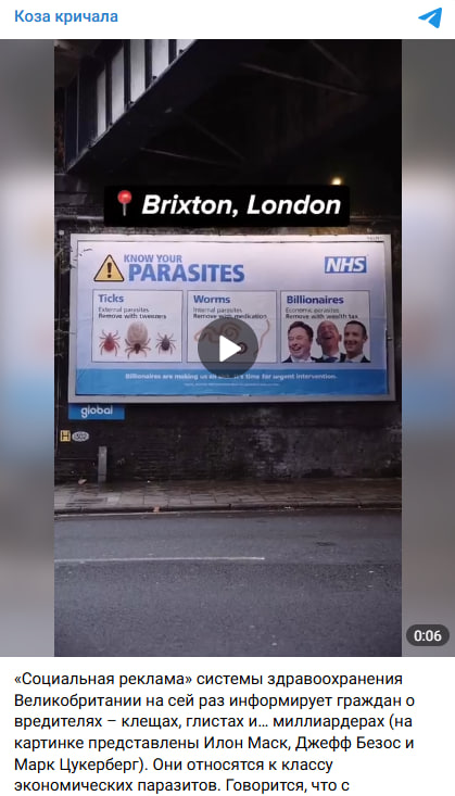 В сети распространяют видео, якобы Национальная служба здравоохранения Великобритании (NHS) разместила в Лондоне баннер с надписью «Знай своих паразитов». На плакате изображены клещи и гельминты, а рядом с ними — миллиардеры, в частности американские предприниматели Илон Маск, Джефф Безос и Марк Цукерберг.