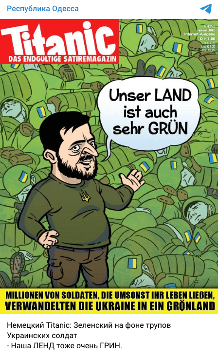 В сети распространяют якобы обложку немецкого сатирического журнала Titanic, на которой Владимир Зеленский стоит перед телами погибших военных. Заголовок на обложке такой: «Миллионы солдат, которые зря отдали жизнь, превратили Украину в Гренландию» (игра слов в немецком языке: Украину называют «Гренландией», что буквально означает «Зеленая земля», потому что из-за большого количества погибших солдат в камуфляже вся Украина якобы «позеленела» — ред.)