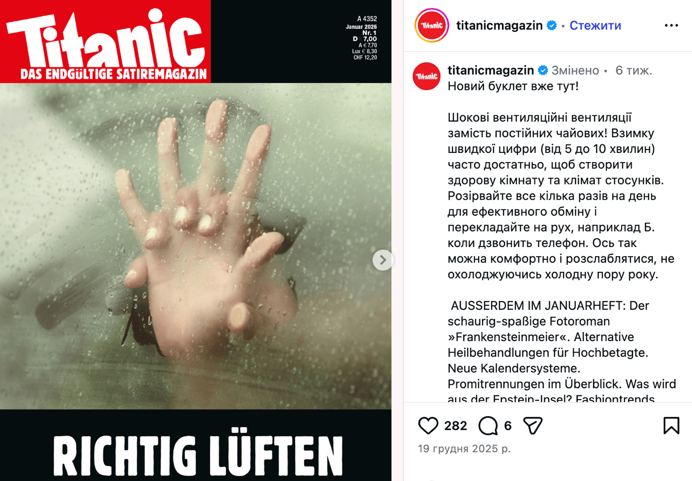 Мы проверили сайт журнала Titanic и его страницы в социальных сетях — такой обложки там нет. В фейковой версии указана дата его выпуска — январь 2026 года. Однако настоящая обложка этого выпуска выглядит совсем иначе: она посвящена проветриванию помещений зимой.