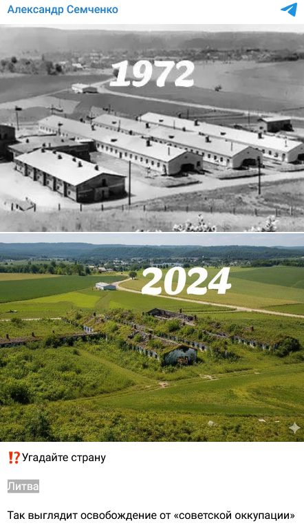 В сети распространяют якобы фотографии колхоза в Литве в 1972 и 2024 годах. На первой фотографии он изображен целым и ухоженным. На втором фото здания заброшены, что якобы свидетельствует о неэффективной власти Литвы после распада СССР.