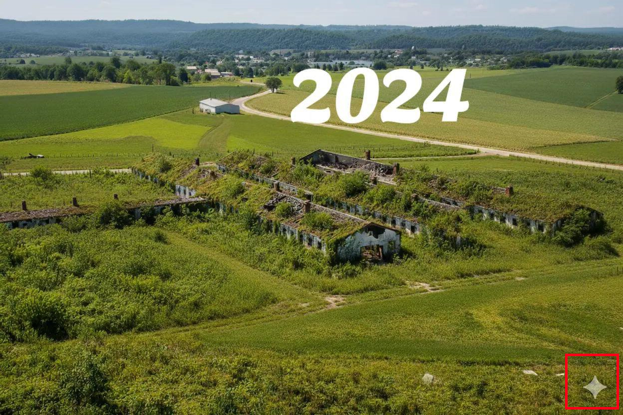 Фото, которое якобы сделано в 2024 году, на самом деле сгенерировано искусственным интеллектом. На фотографии 1972 года видна река, однако ее нет на картинке 2024 года. Вероятно, искусственный интеллект не смог сгенерировать ее, поскольку в сложных изображениях он может опускать детали.