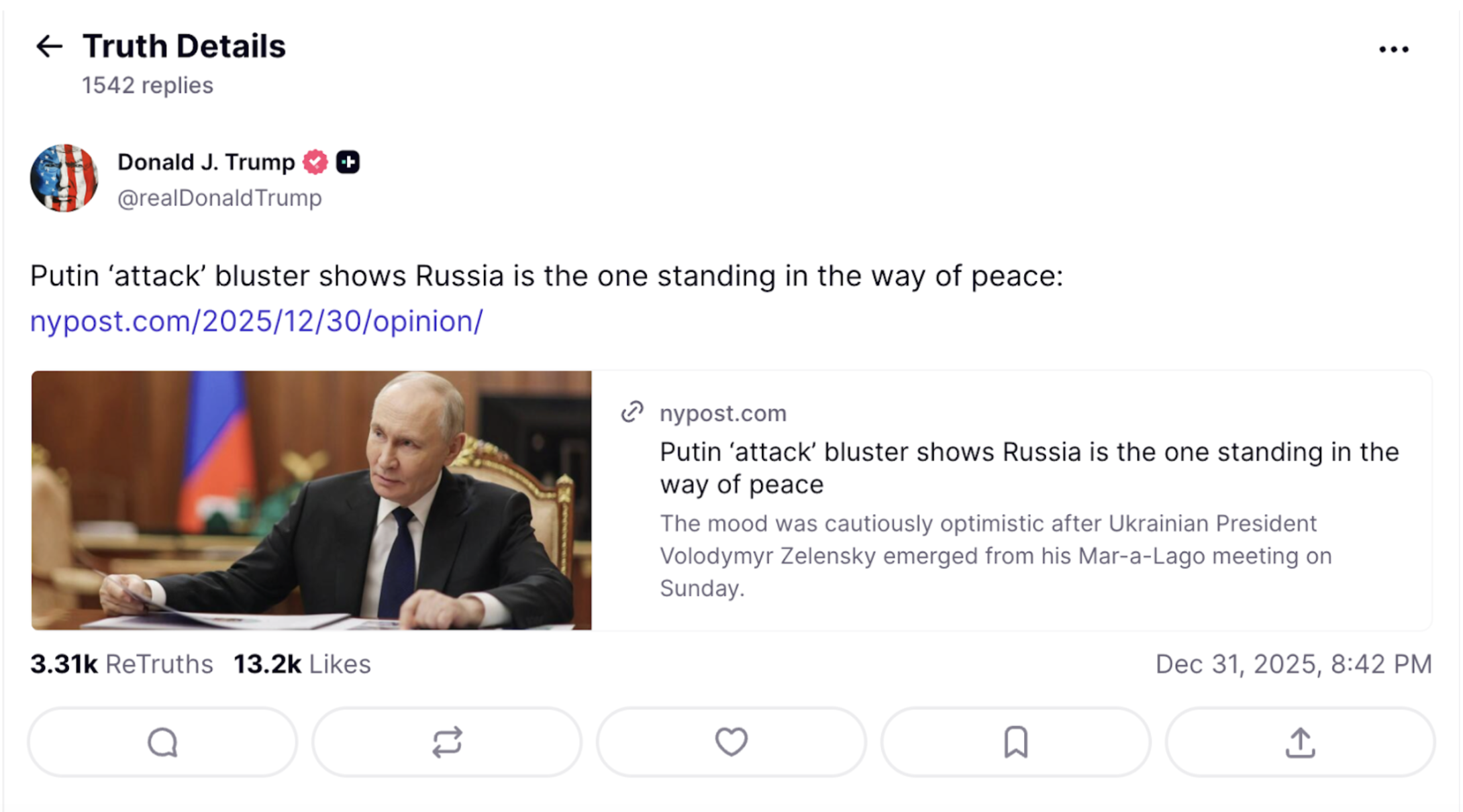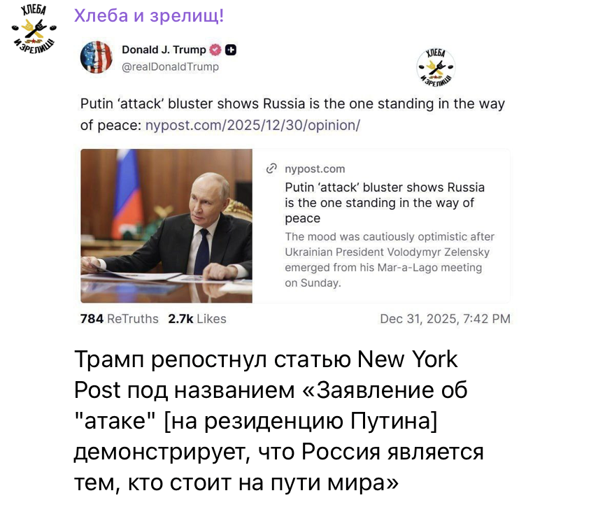 В сети распространяют информацию, якобы Дональд Трамп в соцсети Truth Social распространил статью с названием «Разговоры об “атаке” на резиденцию путина свидетельствуют, что россия стоит на пути к миру».
