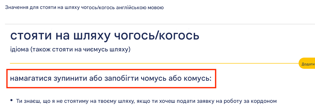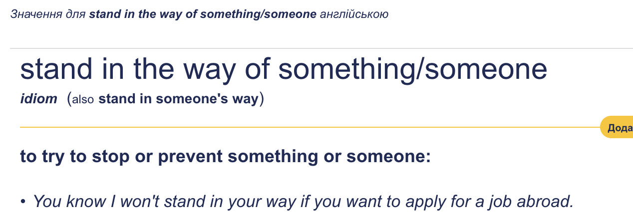 Значение идиомы «to stand in the way» в словаре Cambridge Dictionary (перевод на украинский)