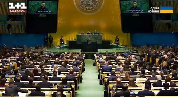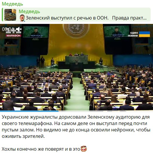 Российские ресурсы распространяют отрывок из выступления Владимира Зеленского на Генассамблее ООН 24 сентября, который показали на «1+1» в эфире телемарафона. Они утверждают, что журналисты телеканала с помощью ИИ «дорисовали» слушателей в зале, чтобы создать впечатление ее заполненности.