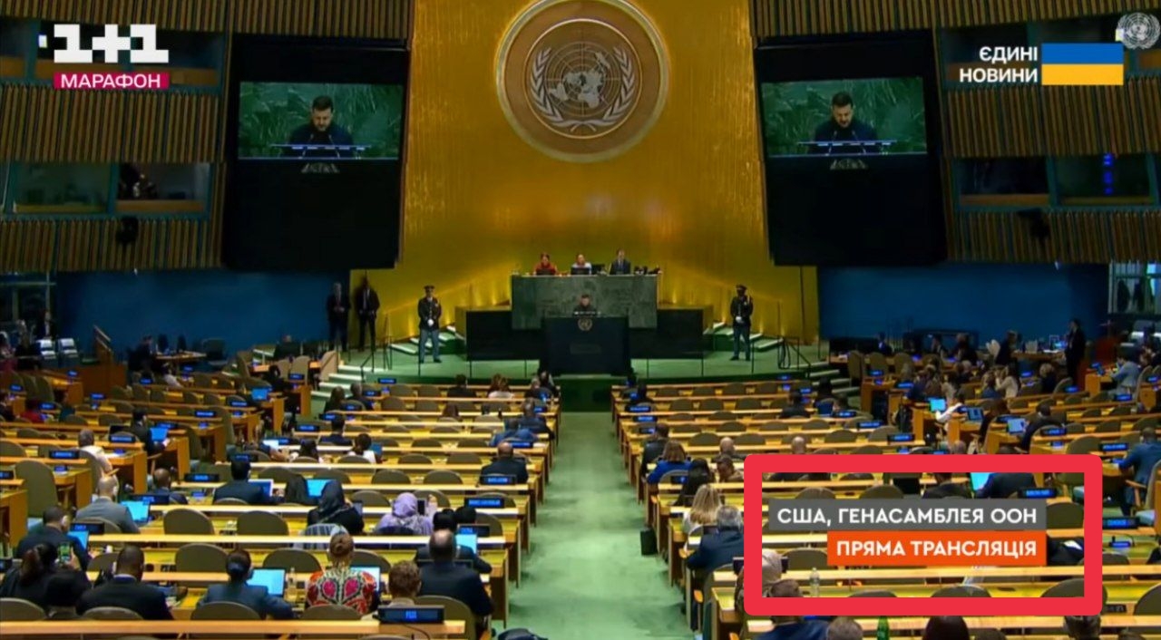 Телеканал «1+1» в рамках телемарафона действительно транслировал речь Владимира Зеленского на Генассамблее ООН 24 сентября 2025 года. Однако в оригинальном эфире не было кадров с заполненным залом, которые опубликовали пропагандисты.