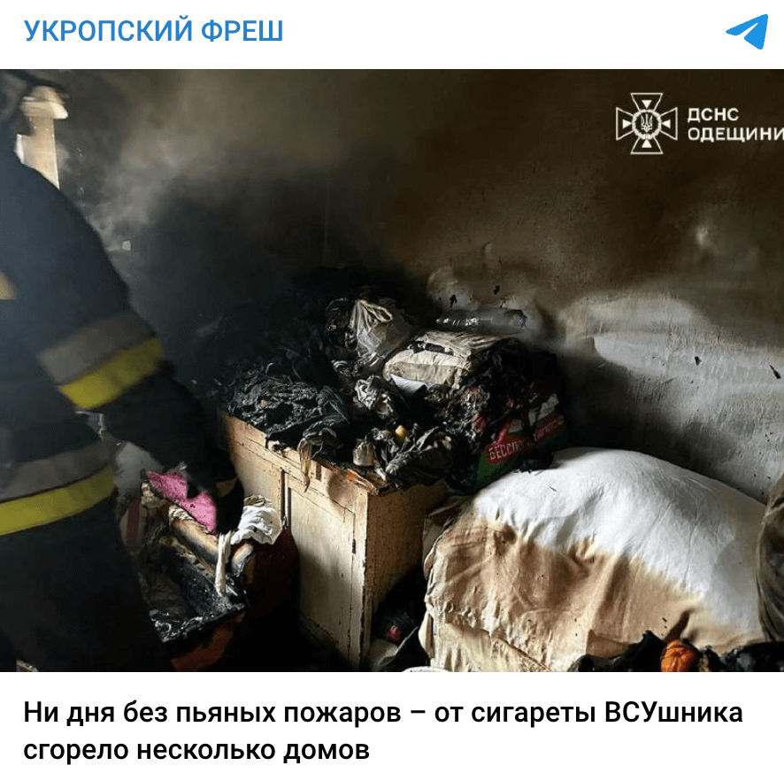 Российские телеграм-каналы распространяют информацию, якобы в селе Сухолужжя Одесской области военный из 225 отдельного штурмового полка (ОШП) в нетрезвом состоянии заснул с сигаретой, что вызвало пожар. Пламя перекинулось на 15 других домов.