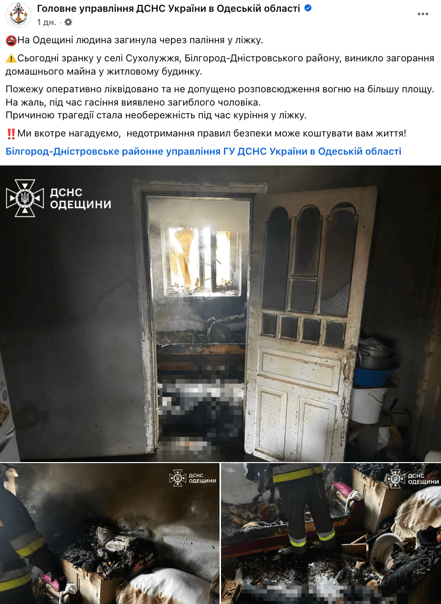 По обратному поиску в Google мы выяснили, что подобная ситуация действительно произошла в селе Сухолужье 30 декабря 2025 года. Как сообщает ГСЧС Одесской области, местный житель погиб из-за курения в постели. Пожар быстро локализовали, поэтому о распространении огня на другие дома речи не идет. Как и о том, что погибший был военным в отпуске.