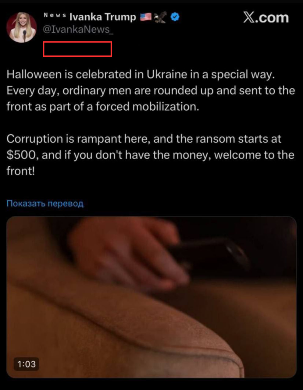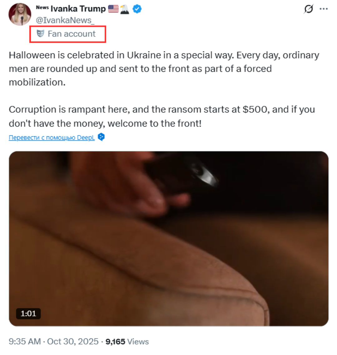 В сети распространяют скриншот поста, который якобы опубликовала дочь президента США Иванка Трамп. В нем она рассказывает, как в Украине работники ТЦК празднуют Хэллоуин, принудительно отправляя мужчин на фронт или требуя взятку от $500. К посту добавляют видео, в котором работники ТЦК задерживают мужчину, потому что тот не дал деньги призраку, который постучал в дверь.