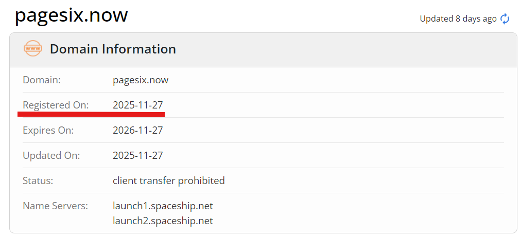 Результат проверки домена поддельного сайта Page Six в инструменте Whois