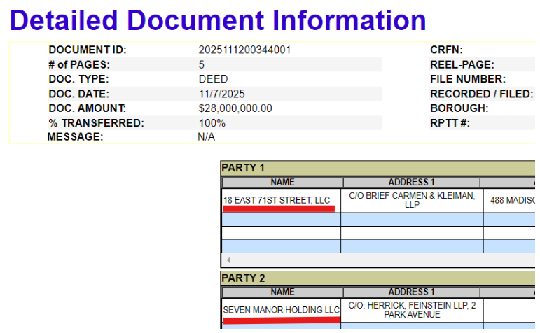В автоматизированной информационной системе городского реестра Нью-Йорка (ACRIS) по адресу, где расположен проданный дом (18 E. 71st St.), указано, что покупателем была компания Seven Manor Holding LLC, а не Film Heritage Inc.