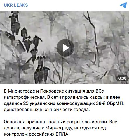 В сети распространяют видео, на котором якобы 25 украинских военных из 38-й отдельной бригады морской пехоты имени гетмана Петра Сагайдачного сдаются в плен российским военным в Мирнограде.