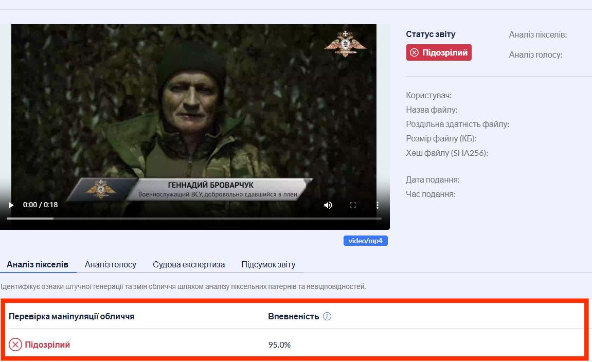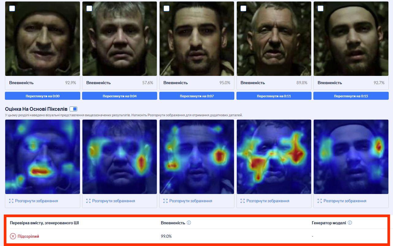 На одной из видеозаписей россияне показали якобы лица некоторых из этих пленных из 38-й ОБрМП. Однако проверка в инструменте Sensity AI показала, что с вероятностью 95% эти кадры содержат манипуляции с лицами. То есть авторы либо заменили настоящие лица мужчин другими, либо создали их с нуля с помощью искусственного интеллекта.