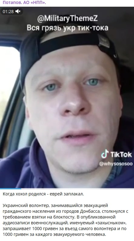 В сети распространяют видео, где якобы украинский волонтер рассказывает, что на блокпосту в Донецкой области военный требовал от него взятку: тысячу гривен за въезд и по тысяче гривен за каждого эвакуированного жителя. На записи есть якобы фрагмент разговора военного и волонтера, где солдат называет жителей Донецкой области «ватниками».
