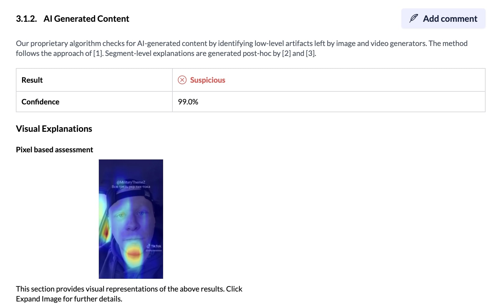 Проверка с помощью Sensity.AI подтвердила, что это видео создали с помощью ИИ. Программа также обнаружила, что для этого применили face synthesis — то есть лицо мужчины полностью сгенерировали с помощью нейросети, создав с нуля, а не на основе реальной фотографии.