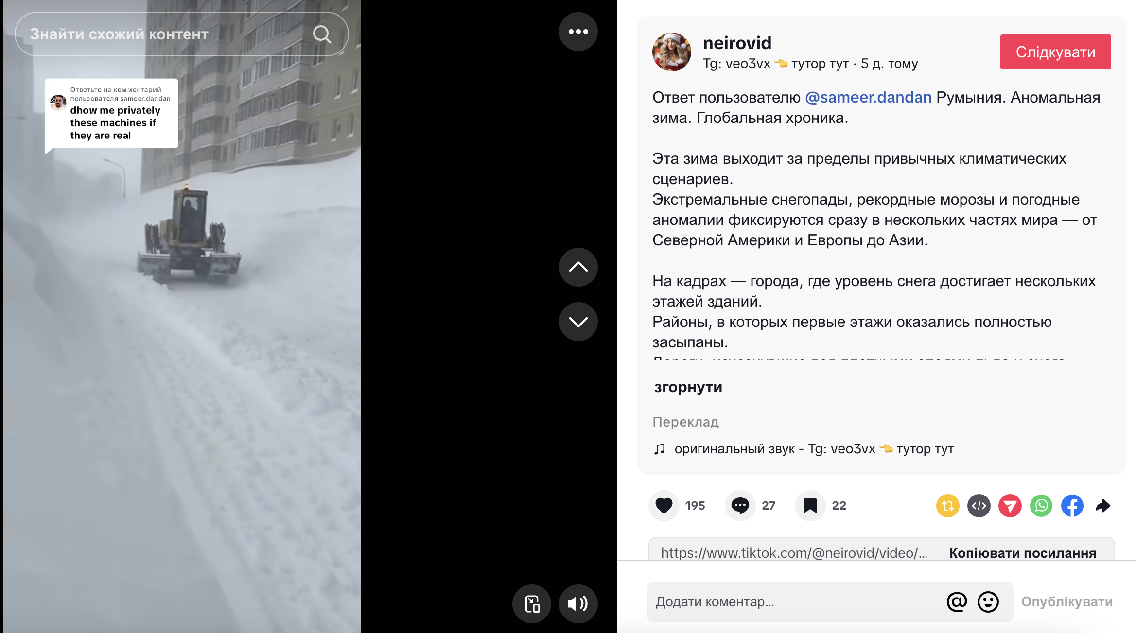 В соцсетях распространяют видео, на котором снегоуборочная машина убирает сугробы высотой в несколько этажей зданий. В посте указывают, что видео снято в Румынии.