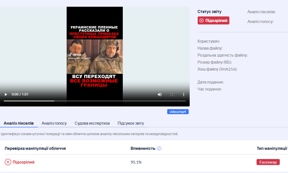 Проверка в инструменте Sensity AI показала, что с вероятностью 95,1% видео сгенерировали с помощью ИИ. Скорее всего, пропагандисты подделали только лицо или его отдельные части, остальные элементы (туловище, каска, фон) настоящие. Технологию подмены лиц (face swap) часто используют для создания дипфейков.