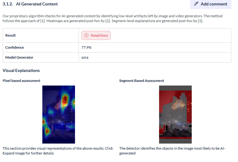 Проверка ролика в сервисе Sensity AI показала, что с вероятностью 77% видео создали с помощью нейросети. Для этого использовали программу Sora.