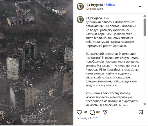 По обратному поиску в Google Lens удалось найти первоисточник видео. Эти кадры сняли дронщики одного из мотопехотных батальонов 93-й бригады «Холодный Яр», когда вели разведку оккупированной части Торецка, а не Константиновки. Видео выложили в сеть 21 февраля 2025 года.