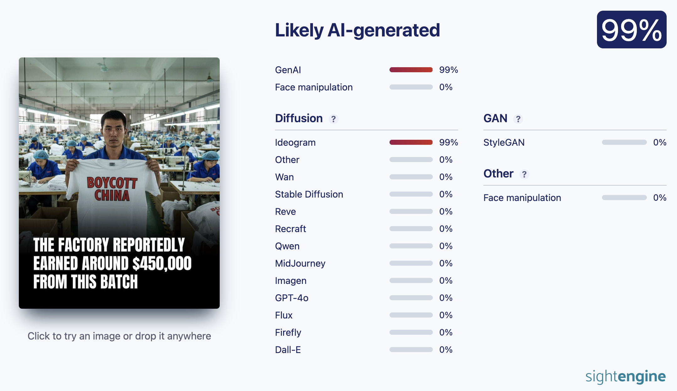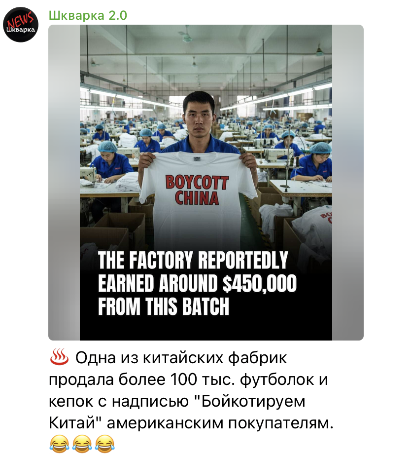 У соцмережах поширюють інформацію, нібито одна з китайських фабрик продала понад 100 тисяч футболок і кепок з написом «Бойкотуйте Китай» американським покупцям. Як доказ автори дописів додають зображення робітників у цехах, які шиють одяг із цим слоганом.